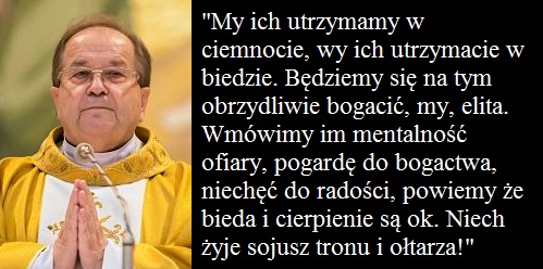 Trzeba im powiedzieć, że bieda, brak rozrywek, szczęścia, czasu wolnego, dadzą nagrodę w raju. I w końcu, trzeba im ograniczyć wolność, możliwość samorealizacji i ekspresji (np w seksie, związkach i wielu innych sferach) i narzucić im konserwatyzm / purytanizm. Jest to potrzebne by system trwał. A przecież bogacić się i być szczęśliwym może tylko elita. Która żadnych skrupułów nie ma.