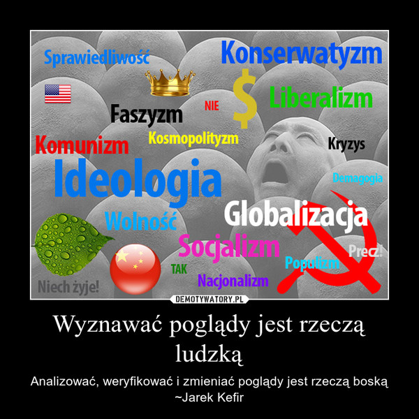 A Ty masz w to ślepo wierzyć. I bronić tego postrzegania świata jako jedynie słusznego. I walczyć na śmierć i życie z wyznawcami innych doktryn. Komu jest to na rękę? Tym, którzy te doktryny wymyślili i dalej wymyślają. Czyli elitom. Ludźmi przestraszonymi (przez religie, wojny, fanatyzmy) i skłóconymi (przez ideologie, polityków) łatwiej się rządzi.