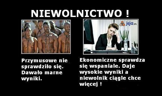 Co mamy dziś? Często szef sadysta, psychopata. Choć co dwa lata kupuje nowego merca z salonu, to pracownikom nie zapłaci więcej, niż najniższa krajowa. Ciągłe straszenie, że za bramą czeka kolejka chętnych. Że jeszcze jeden dzień chorobowego, to wylecisz. A nawet jak szef pozwoli, to: „wracaj do roboty, bo nie będziemy za trzech jebać”. Często jest to wielomiesięczny, wieloletni stres, mobbing, nękania, docinki. Typowa atmosfera w biurze czy korporacji to zawistne do granic osoby, spiskujące, plotkujące, siejące intrygi, podkładające świnie.