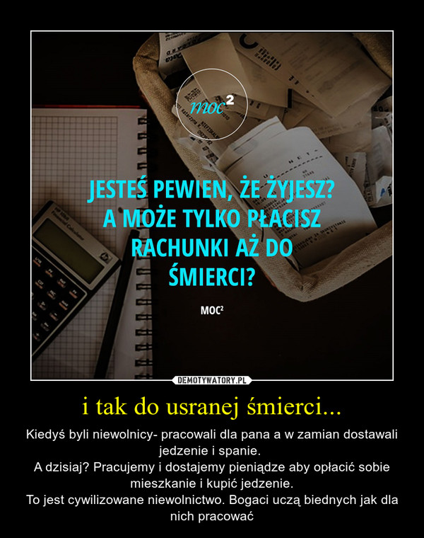 Kolejna ważna rzecz: co możesz kupić za swoją pensję? Czy stać Cię na hobby, na wakacje, na podróże? A może starczy Ci tylko na podstawowe produkty? Niewolnik, np chłop pańszczyźniany, miał zapewnione mieszkanie, jedzenie, odzienie. Zaś polowania, frykasy na stole i podróże były domeną szlachty, czyli ludzi wolnych. Tak samo jest dziś. Czy dom, mieszkanie, samochód masz na własność czy na kredyt? I co z Twoim czasem wolnym? Czy możesz tak jak wolni ludzie spać tak, by być zdrowym? Czyli do momentu, gdy wybudzi Cię podświadomość, a nie budzik? Ile masz czasu dla siebie, dla partnera, dla rodziny?