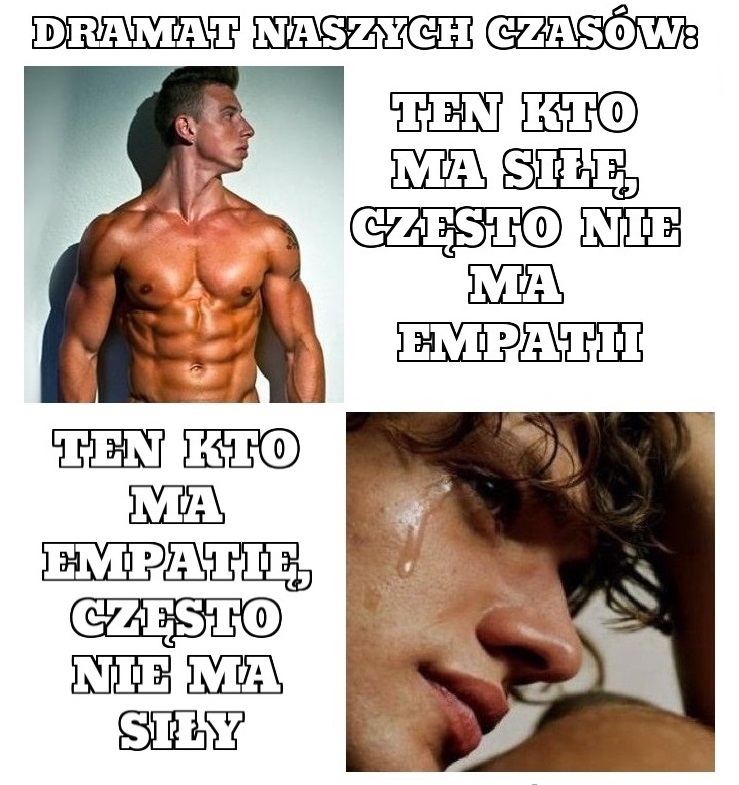 Pierwszy kłopot polega na tym, że często ten, kto ma siłę, nie ma empatii, zaś ten, kto ma empatię, często nie ma siły. Natura bardzo rzadko daje cały pakiet fajnych i pożądanych cech. Najczęściej daje pewną ich część. Poza tym jeśli ktoś odnosi sukcesy w życiu i z kobietami będąc silnym brutalem, to nie będzie chciał wykształcać w sobie pierwiastka empatii. Bo i po co mu to, skoro cały świat jest u jego stóp, a empatia jest dla „tych leszczy” nie umiejących rozpychać się łokciami.