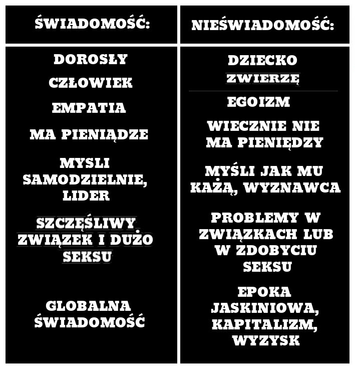 To idzie trochę dalej, powyższa grafika jest uproszczeniem. Biegun świadomości to często samozatrudniony, hobbysta lub inwestor. Biegun nieświadomości to wyzyskiwany robotnik. Biegun świadomości ma granice i umie je wyraźnie stawiać. Biegun nieświadomości nie ma granic, nie umie ich stawiać i o nie walczyć. Biegun świadomości to osoba wolna, a nieświadomości – to niewolnik (np ideologii, religii, państwa, pracodawcy, banku w którym ma kredyt, ekonomii).