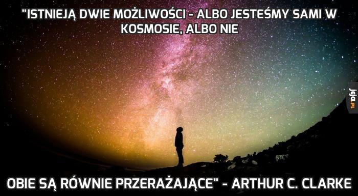 Ale wyobraź sobie coś takiego.. Niezmierzona głębia kosmosu. 92 biliony lat świetlnych kosmosu, które znaliśmy już w 2012 roku. Czy są tam inne, żyjące istoty oprócz tych na Ziemi? Nie, ani jednej. Zimna, niezamieszkała, martwa, olbrzymia otchłań wszechświata. Planety nawet tysiąc razy większe od Ziemi. Pokryte miliardami kilometrów kwadratowych zaśnieżonych skał. Bez nawet jednej roślinki. Lub planety z falami morskimi wielkości pięciu kilometrów. Tudzież planety na której istnieje kilkadziesiąt tysięcy aktywnych wulkanów. Na istnienie obcych cywilizacji do dziś nie ma realnych i niepodważalnych dowodów. Nie wylądowali przed gmachem ONZ i nie przedstawili się całej ludzkości. Wielka, ogromna pustka. jesteśmy tylko my, nie wiadomo skąd, nie wiadomo dlaczego i nie wiadomo w jakim celu.