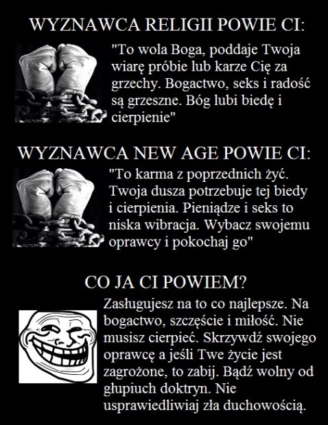 Nie atakuj tak samo biednego bliźniego za to, że ma inne poglądy. Dotychczasowe rewolucje, według teoretyków spisku, były organizowane przez elity lub przez część elit po to, by napuścić jedną grupę biedoty na drugą grupę biedoty. Motłoch się wyrzynał w pień, stawiał na sztandarach „jedynie słuszną” ideologię z lewa lub prawa, a elita przejmowała całość władzy. Lub przynajmniej bogaciła się. Nie wiem na ile jest to prawdą, wiele tych wydarzeń zakrywa już piołun milczenia. Wiele z nich pozostanie na zawsze tajemnicą, jak i co najwyżej punktem sporu dla historyków z lewa i prawa.