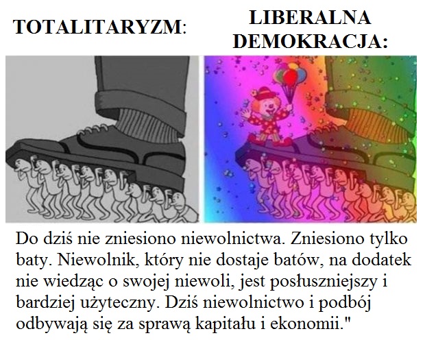 Stary system ma obecnie inną nazwę. Dawniej wolny był tylko cesarz (imperator), król lub książę i jego dwór. Cała reszta kraju była jego niewolnikami. I to oficjalnie, bo całe cesarstwo, królestwo czy też księstwo należało do jego władcy i pośrednio do elity. Potem nastał ponury okres XX wieku, dwóch ustrojów totalitarnych i gułagu. No i po upadku ZSRR w latach ’90 Francois Fukuyama ogłosił najbardziej błędną tezę stulecia. Teza ta to tak zwany „Koniec Historii” i triumf nowej wersji systemu niewolniczego, czyli liberalnej demokracji.