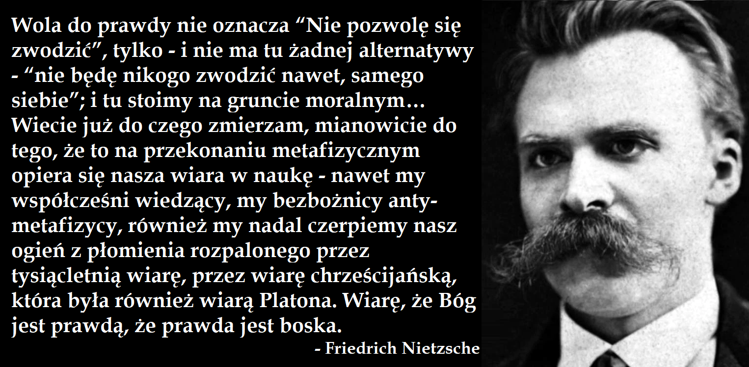 Cytat: „Wola do prawdy nie oznacza: ‚nie pozwolę się zwodzić’, tylko – i nie ma tu żadnej alternatywy – ‚nie będę nikogo zwodzić, także samego siebie,’ i tu stoimy na gruncie moralnym… Wiecie już, do czego zmierzam, mianowicie do tego, że to na przekonaniu metafizycznym opiera się nasza wiara w naukę. Nawet my współcześni wiedzący, my bezbożnicy anty-metafizycy, również my nadal czerpiemy nasz ogień z płomienia rozświetlonego przez tysiącletnią wiarę, przez wiarę chrześcijańską, która była również wiarą Platona. Wiarę, że Bóg jest prawdą, że wiara jest boska. „Koniec cytatu.