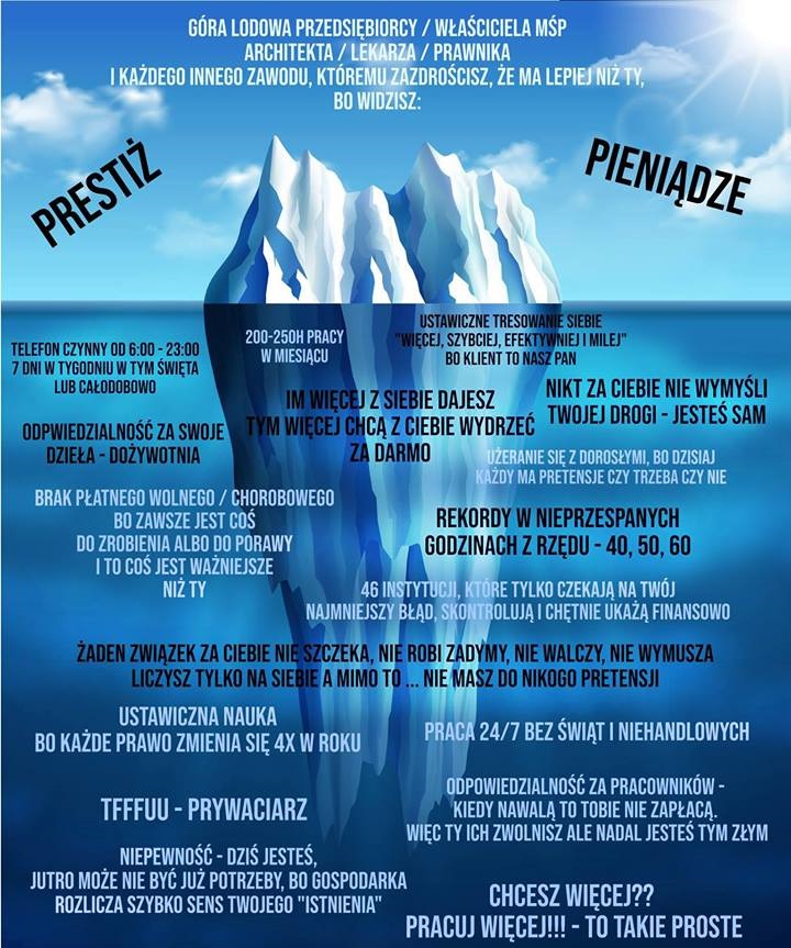 Prawda, że smutny to obraz wolności? Nieosiągalny dla większości z nas? Bo społeczeństwo, szkoła, matula, tatulo nam wmówili, że ciężka praca u kogoś na etat to wzór cnót i spełnienia życiowego? Tak na marginesie: czym różni się praca w fabryce przez 8 godzin za 3000 zł, od pracy w biurze przez 11 godzin za 4500 zł? Dla tych 1500 złotych więcej tracisz aż 3 godziny, i zabierasz część pracy do domu. A wesoły robol wychodzi na fajrant z zegarkiem w ręku, i w czasie, gdy Ty pracujesz, on pije piwko, układa wieżę z klocków Lego z dziećmi, odpoczywa w ramionach ukochanej.