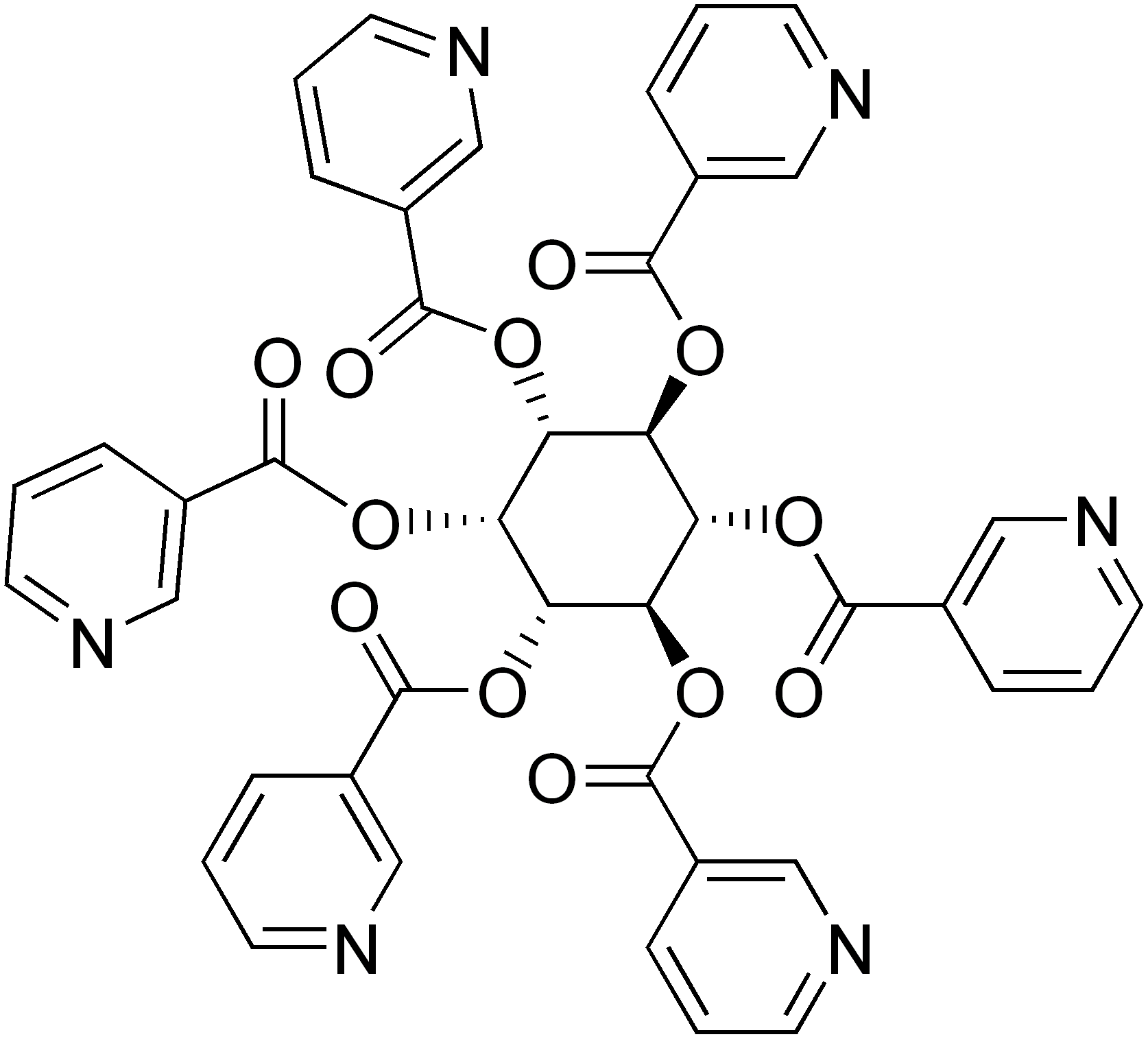 Ostatnio furorę robi heksa-nikotynian inozytolu, czyli sześć cząsteczek kwasu nikotynowego podczepionego do pierścienia inozytolu. Czy jest to dobry wybór? Najpierw popatrz na wzór chemiczny tej formy witaminy B3 / PP, choć wiem, że większość z nas chemii nie lubi:
