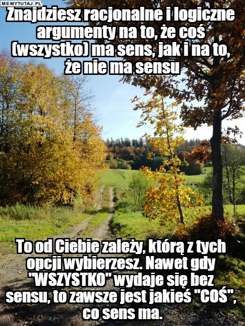 Znajdź swoje „coś”, co ma sens i cel, w tym całym oceanie pozornego bezsensu. W pewnym momencie warto przestać patrzeć na całość – na ignorancję, głupotę, brak świadomości, przemoc i tak dalej, i warto wtedy skoncentrować się na tym, na co masz realny wpływ i co dla Ciebie naprawdę ma sens.