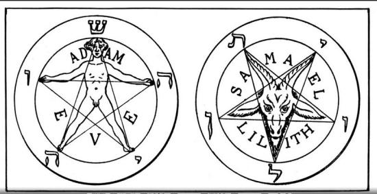 NA ZDJĘCIU poniżej: ezoteryczne przedstawienie „dobrego”. Adama i „złego” szatana. Przejście od dobrego Adama do szatana oznacza przekręcenie okręgu o 33 stopnie. Właśnie tyle jest wolnomularskich stopni wtajemniczenia, potem jeszcze 11 stopni wyższych (do 44). Masoni uważają, że służą zarówno jednemu, jak i drugiemu.