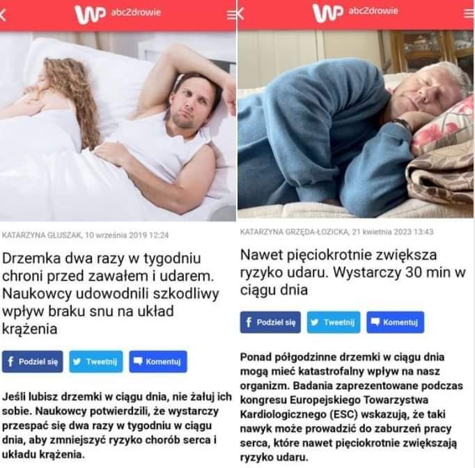 Na obrazku widzisz dwa całkowicie różne doniesienia z tego samego, popularnego w Polsce portalu internetowego. Przykłady takich całkowicie sprzecznych stanowisk tak zwanej nauki można mnożyć. Podobnie sprawa miała się ze spożywaniem jajek – w jednym artykule były one opisywane jako bardzo niezdrowe, zaś w innym – wręcz przeciwnie..
