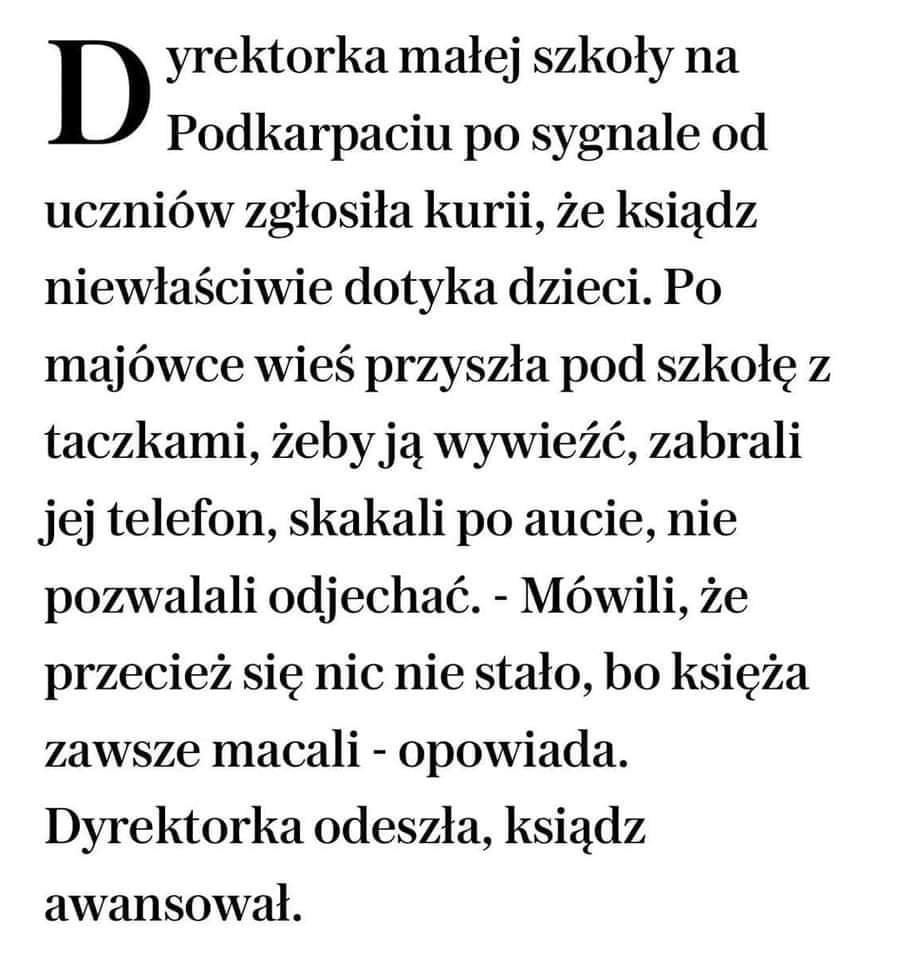 Niestety to nie fejk, lecz coś, co jest prawdziwe. Wśród tych ludzi pokutuje przekonanie, że świętość to świętość, i nawet jeśli czasami komuś z kościoła zdarzy się złe zachowanie, to i tak trzeba na to przymknąć oko. Bo podnoszenie ręki nawet na złego księdza to jednocześnie podnoszenie tej ręki na cały kościół. Jako instytucję, sprawnie działającą maszynę.