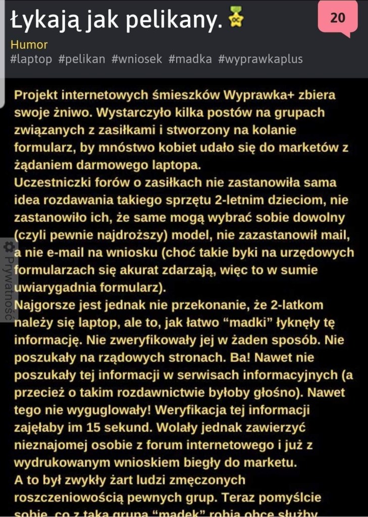 W tym celu stworzyli fałszywy wzór wniosku o darmowego laptopa na każde posiadane dziecko. Matki, w przerwie między theSperadoskiem a zrobieniem tipsów, miały się zgłaszać do sklepów typu Media Expert z wypełnionym fejkowym wnioskiem. I w ciągu poprzedniego tygodnia (28.08 – 02.09.2023), mnóstwo ludzi sterroryzowało sklepy mediowe, a gdy docwiadywali się od pracowników, że zostali wkręceni, a żadnych laptopów za darmoche nie będzie. Pracownicy tych nieszczęsnych przybytków wylewali gorzkie żale na dowcipnych internautów.