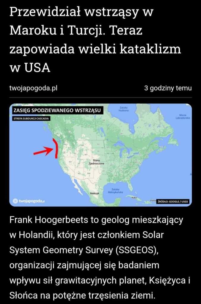 A teraz jeszcze to, po niszczących trzęsieniach ziemi, zapowiedź kolejnego, w USA. A tam Pacific Rift i kaldera Yellowstone. I co o tym sądzisz? Zapraszam do dyskusji.