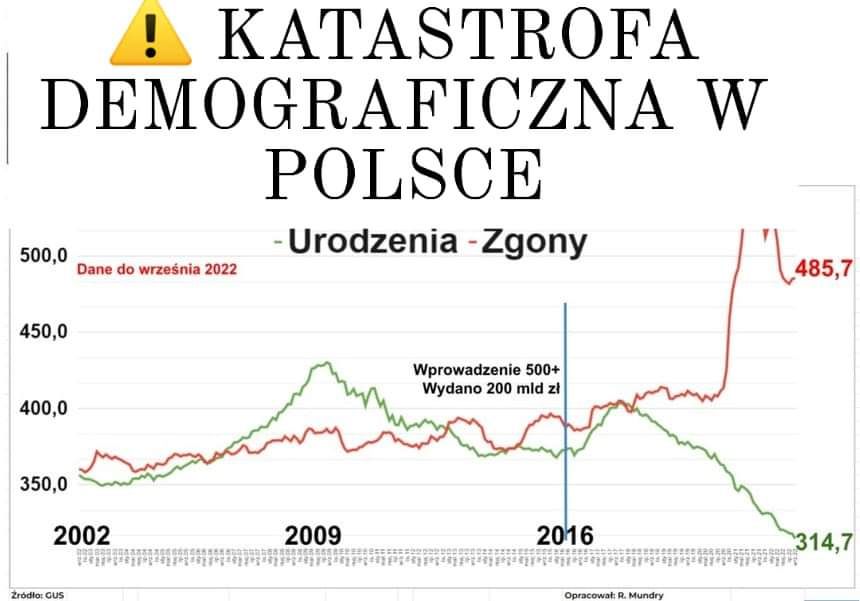 Mamy współczynnik urodzeń daleko poniżej zastępowalności pokoleń. Rok 2023 był pod tym względem rekordowy, gdyż urodziło się najmniej dzieci od końca II Wojny Światowej. Czyli zaledwie 290.000. Zaś od czasów grasowania pewnego maleństwa, które podobno „tak tylko przypadkiem” uciekło z laboratorium, mamy też nadmierną ilość zgonów, w porównaniu do średniej z lat 2016 – 2019.