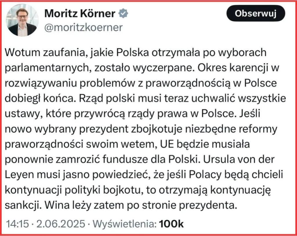 CO ZA BEZCZELNY NIEMIEC! Jak ktoś ma wątpliwości, w czyim interesie była wygrana Trzaskowskiego to tutaj jest odpowiedź. Moritz Körner europoseł i sekretarz generalny niemieckiej partii FDP (koalicjant Hołowni w europarlamencie). Znowu nas szantażują, bo wygrał nie ten, co według Brukseli i Niemiec powinien. Kiedy się obudzicie?