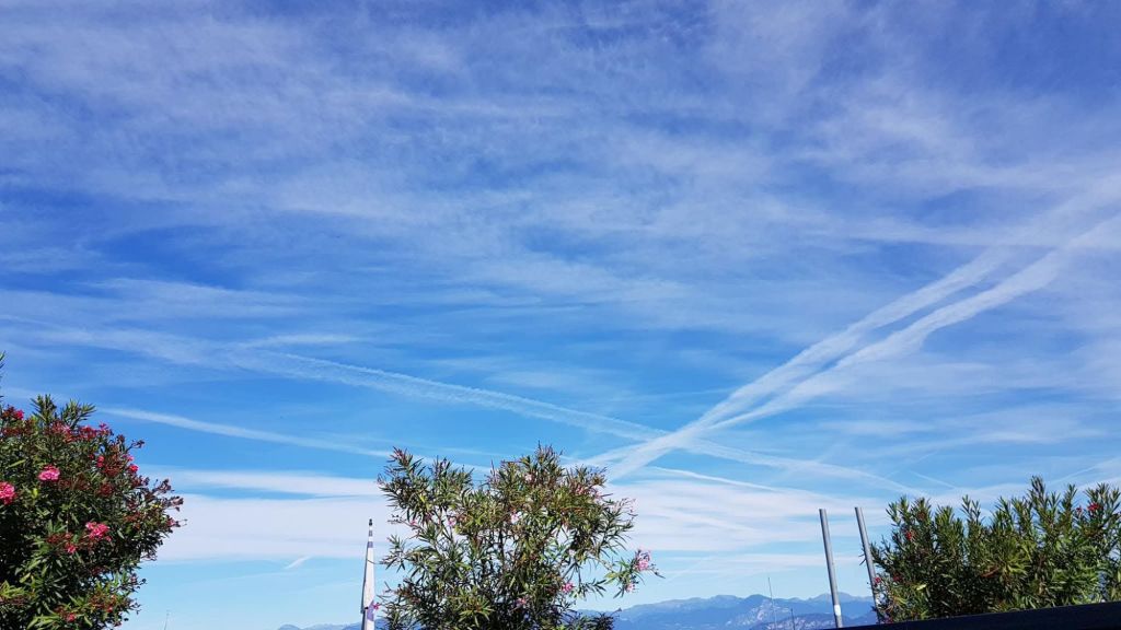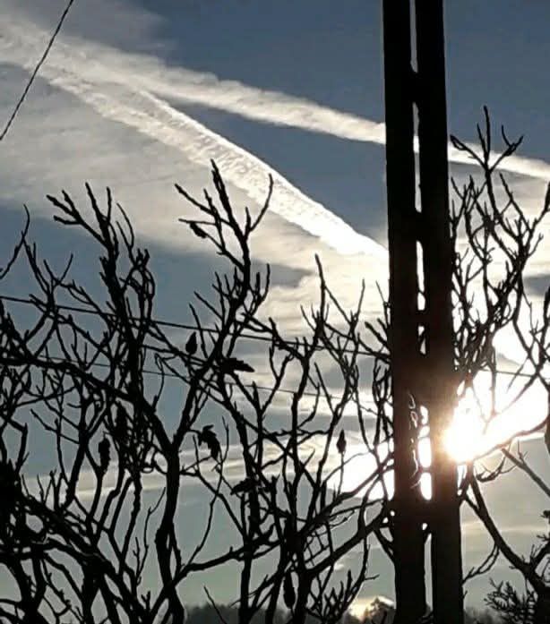Oprócz tego linie zostawiane przez samoloty, których czasami nie widać na Flight Radar, czyli na interaktywnej mapie poszukującej przeloty samolotów z całego świata. Linie te zostają, a potem rozmywają się na całe niebo, przysłaniając część światła słonecznego. Sama tarcza słoneczna jest wielka, a światło naszej macierzystej gwiazdy, poprzez przebijanie się przez tą białą zawiesinę, jest ostre, bardzo jaskrawe, strasznie razi w oczy. Trudno na nie patrzeć, trudno kierować wzrok nawet w okolice tarczy słonecznej.