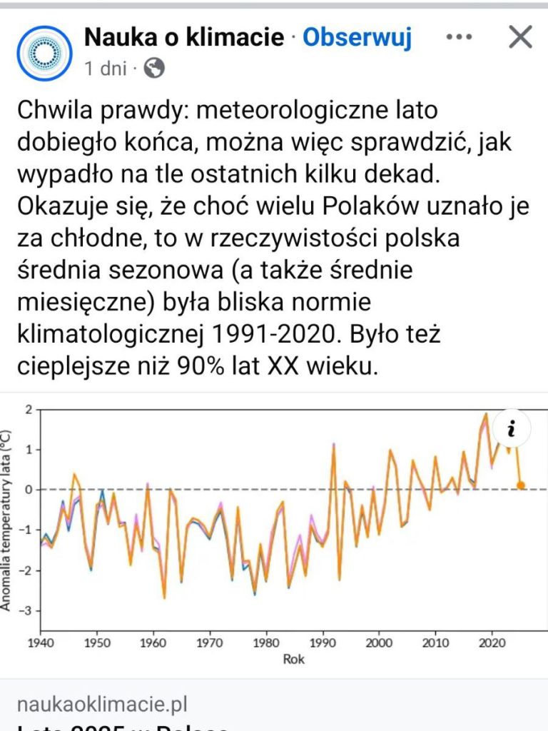 Admin powołuje się na średnie dobowe (które zaniżają chłodne noce) i mówi: wszystko w normie. Ale zapytaj o średnie maksymalne, o sumy opadów, o nasłonecznienie – cisza. Bo fakty są niewygodne. Tegoroczny lipiec był chłodny, mokry i nijaki, a oni próbują wmówić ludziom, że tak było zawsze. Kłamstwo w biały dzień. W latach 70., 80. i 90. nie brakowało stabilnych okresów 25–28 stopni i słońca. Upalnych dni powyżej 30 stopni było mniej, ale lato było bardziej słoneczne i radosne.