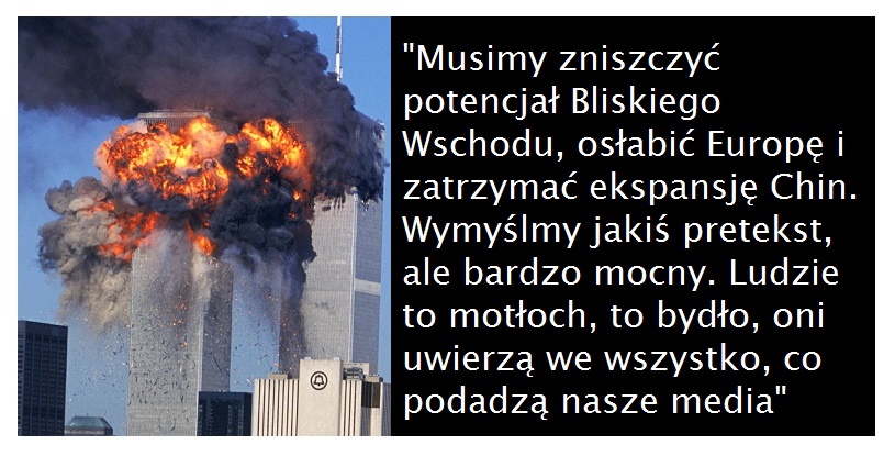 Podsumowując: jakże dziwne jest to, że gdyby nie te zamachy, to USA nie byłyby w stanie realizować wielu celów w swojej polityce zagranicznej. Czy zamachy 11 września były typowym „zamachem false flag„, jak mówią teoretycy spisku? Z historii znamy cały ogrom takich przypadków. Przecież nawet II Wojna Światowa zaczęła się przez typowy zamach false flag. Tym zamachem była tzw „prowokacja Gliwicka”, w której żołnierze Werchmahtu, przebrani w Polskie mundury, zaatakowali niemiecką radiostację w Gliwicach.