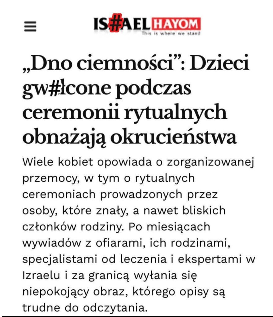 W lsrahellu mają swoją „aferę Epsteina.” Dzieci z ortodoksyjnych rodzin, lub dzieci przechwycone lub spłodzone przez członków tajnych organizacji doświadczały niewyobrażalnych okrucieństw ze strony…. bliskich krewnych, często nawet rodziców, jak i tamtejszych przywódców religijnych, prowadzących takie rytuały.