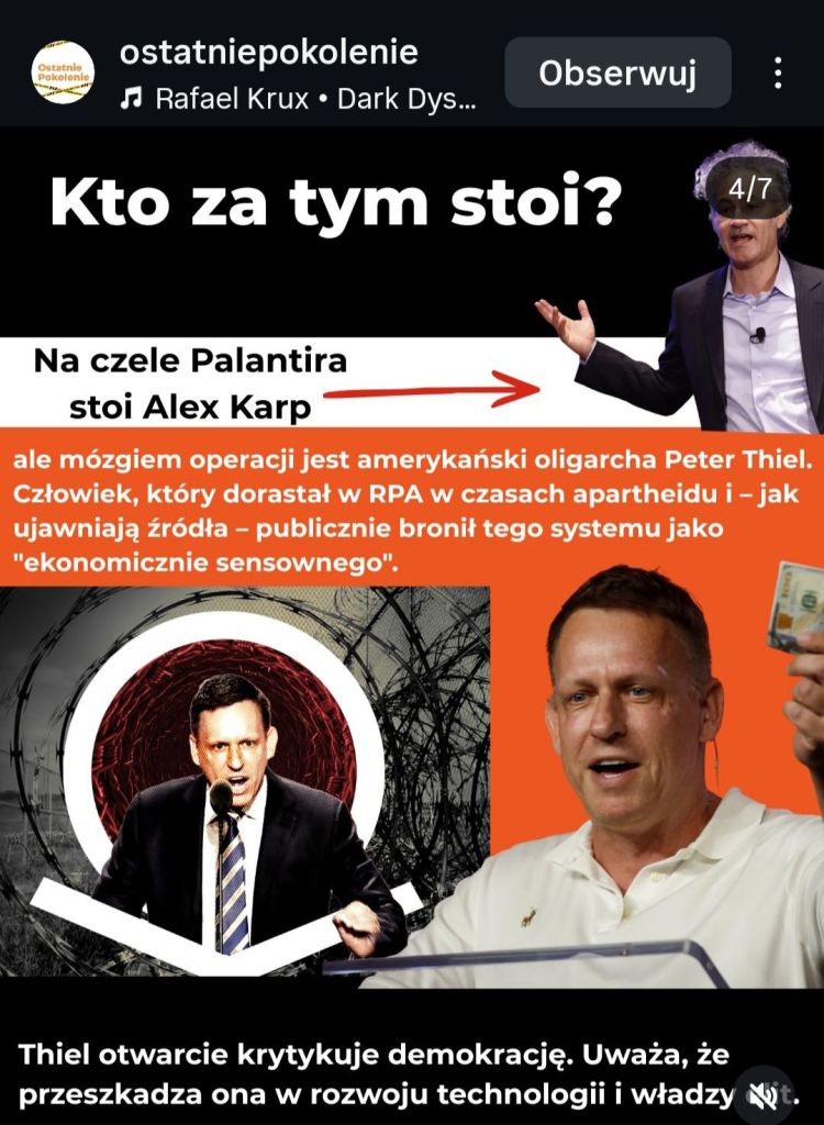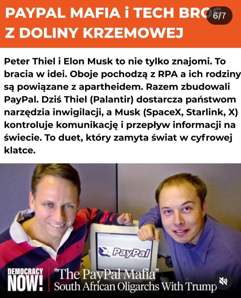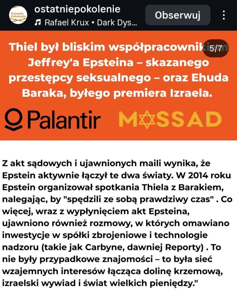 Tymczasem gdzieś ponad tym całym chaosem istnieje inny, bardzo mroczny świat, gdzie dzieją się rzeczy niewyobrażalne dla zwykłych ludzi, świat, przy którym schizofrenicy wydają się całkiem zdrowi. Świat pieniędzy, technologii i wpływów. Sprawa Epsteina zaczęła rzucać światło na fragment tej ośmiornicy władzy. Pojawiają się nazwiska ludzi z Doliny Krzemowej, finansistów, polityki i spec służb. Konszachty biznesowe, spotkania w tajnych miejscach, inwestycje, wspólne projekty technologiczne. Ich wspólne sieci powiązań pokazują, jak bardzo współczesny świat władzy przenika się z sektorem technologii. Firmy zajmujące się analizą danych, systemami nadzoru (słynny System Kredytu Społecznego z Chin), stały się dziś wisienką na torcie.