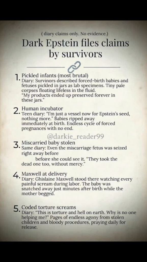 2️⃣ Ludzki inkubator. Pamiętnik nastolatki: „Jestem teraz tylko naczyniem dla nasienia Epsteina, niczym więcej.” Dzieci były odbierane natychmiast po urodzeniu. Niekończący się cykl wymuszonych ciąż bez końca.