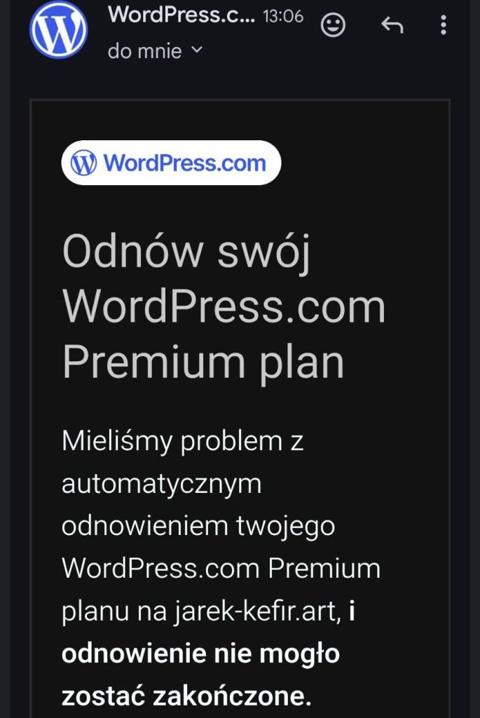Pokażmy swoją siłę. Wierzę w Was i w siebie, bo teraz pracuję od poniedziałku do soboty włącznie, i zarabiam troszkę więcej. Cześć pójdzie z mojej wypłaty, a część, mam nadzieję, że od Was, że pozwolicie mi załatać tę dziurę w budżecie domowym, która wtedy powstanie. Jako dowód wklejam maila od systemu WordPress: